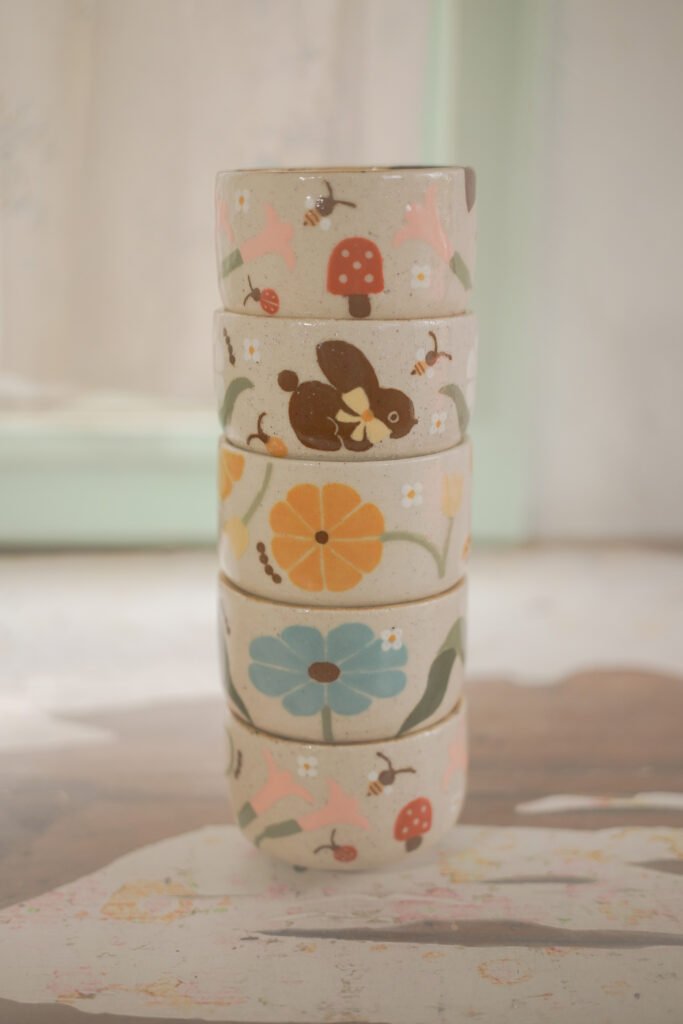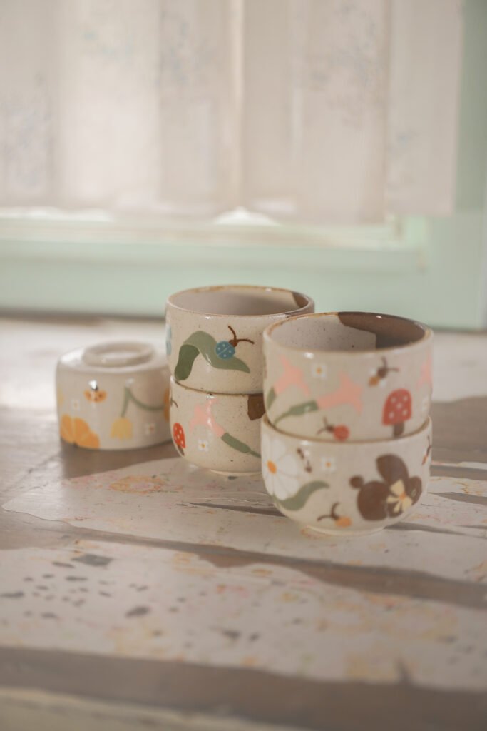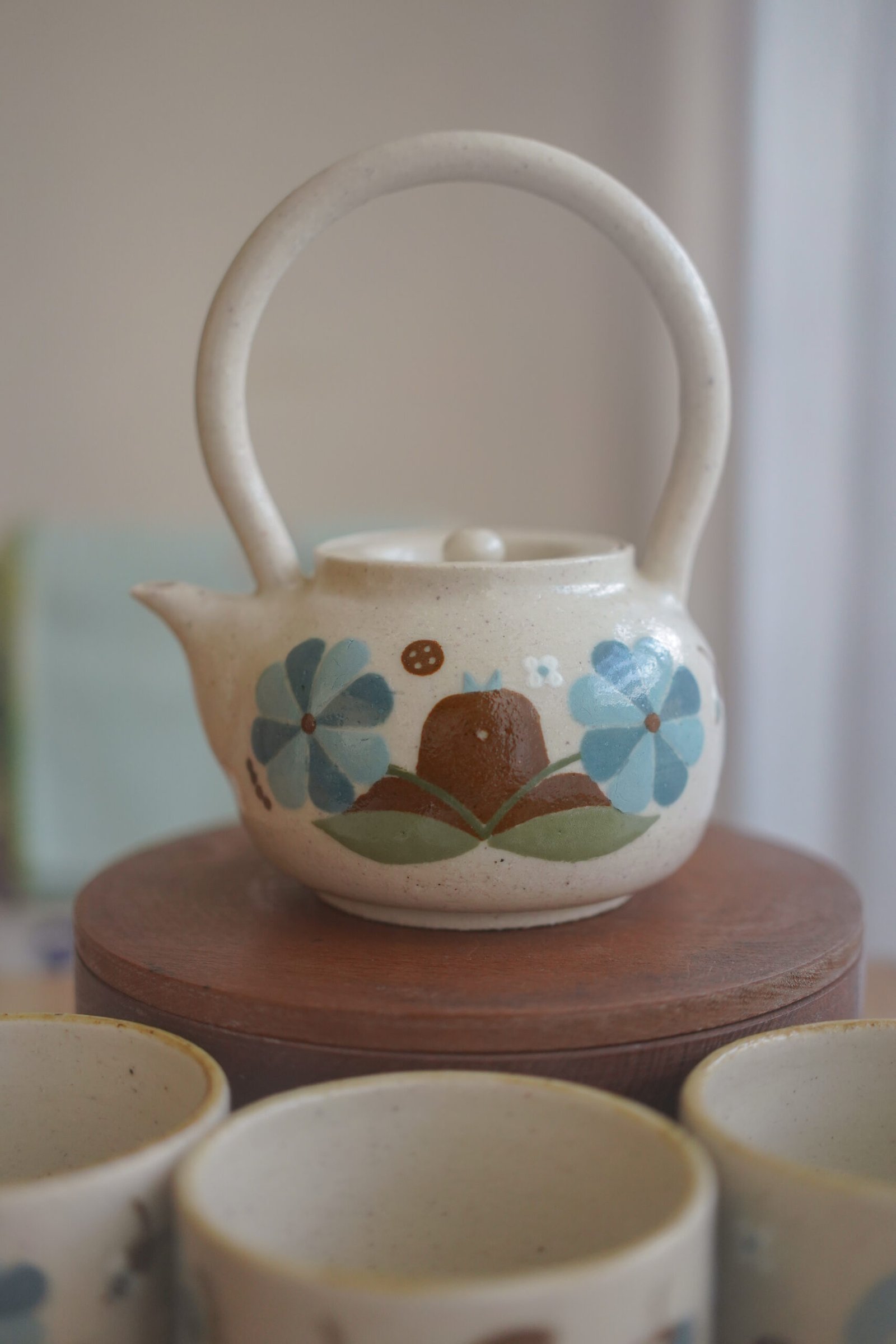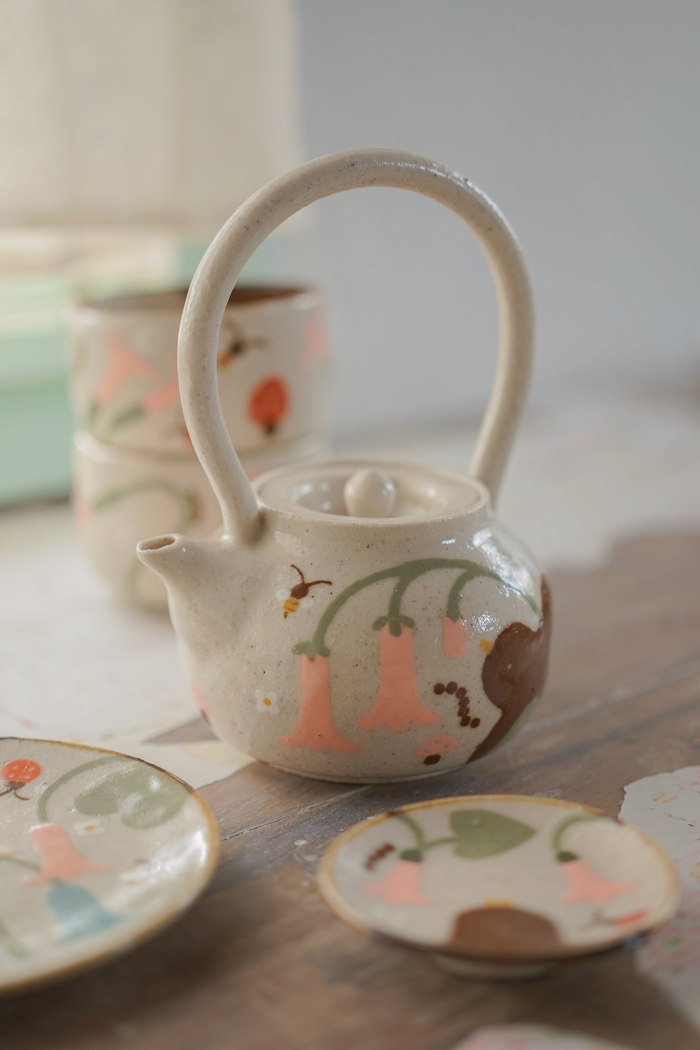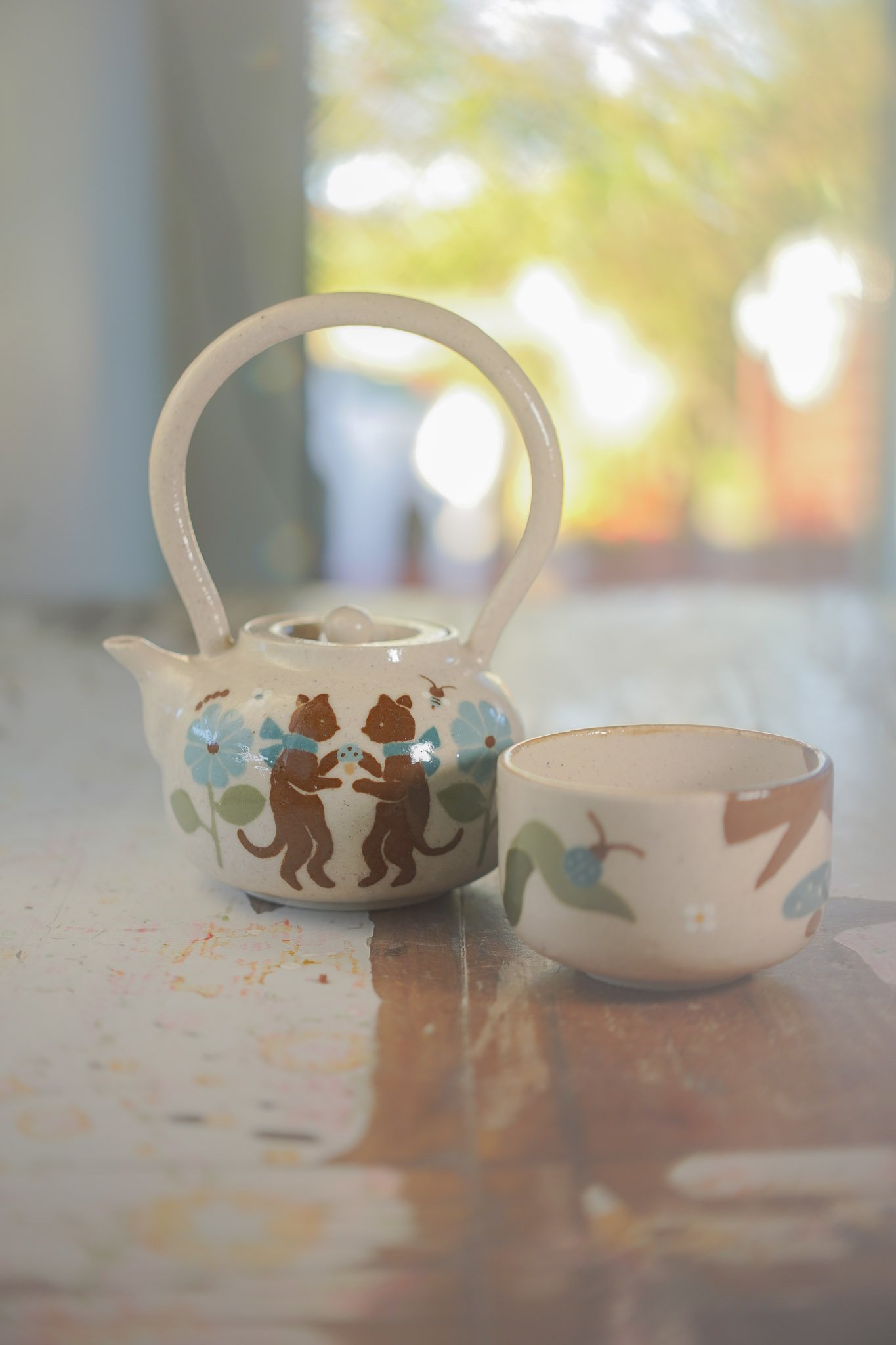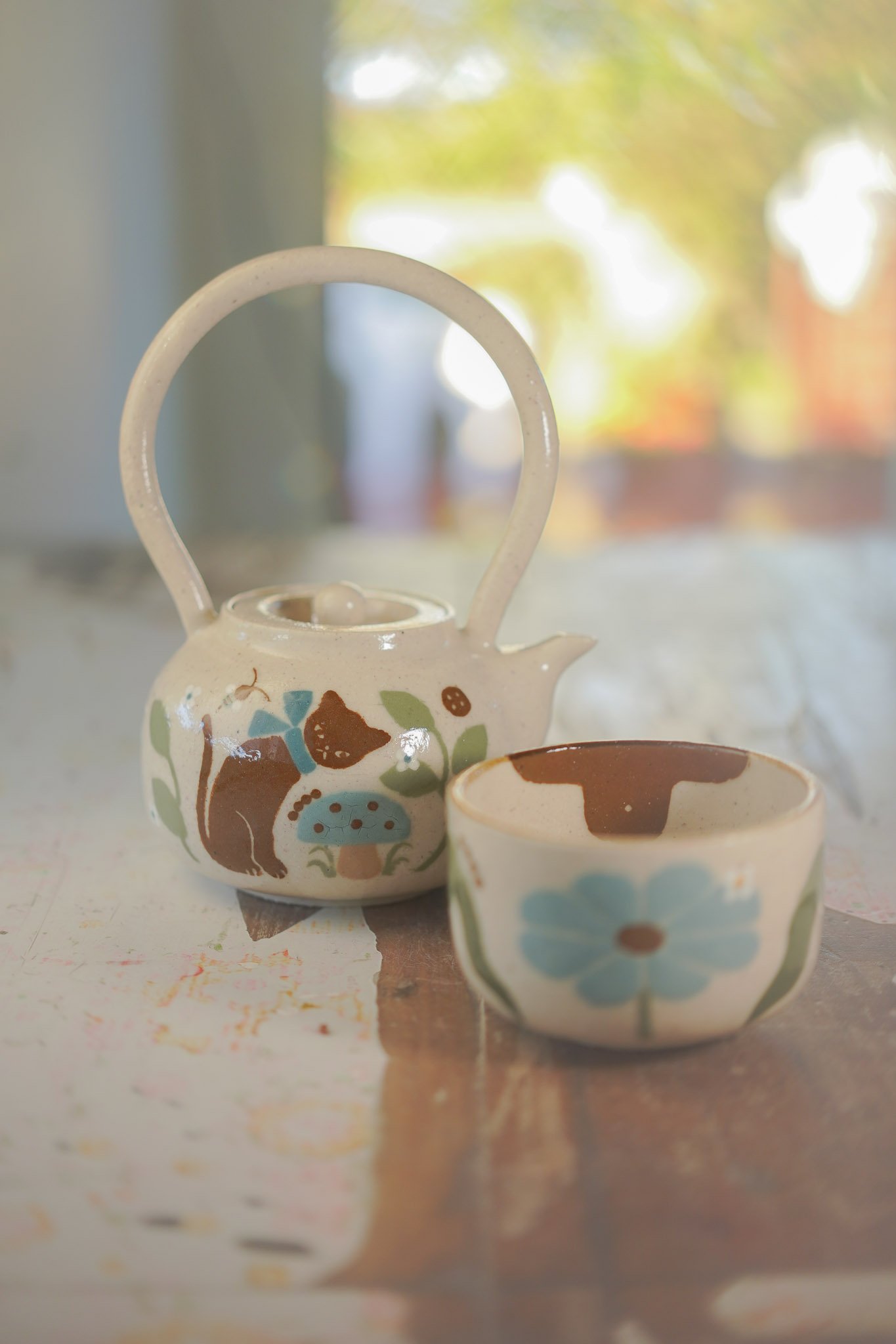 Teteras y tazas hechas en torno alfarero con filtro interno construido / gres de 1230°. Esmaltadas y pintadas a mano.