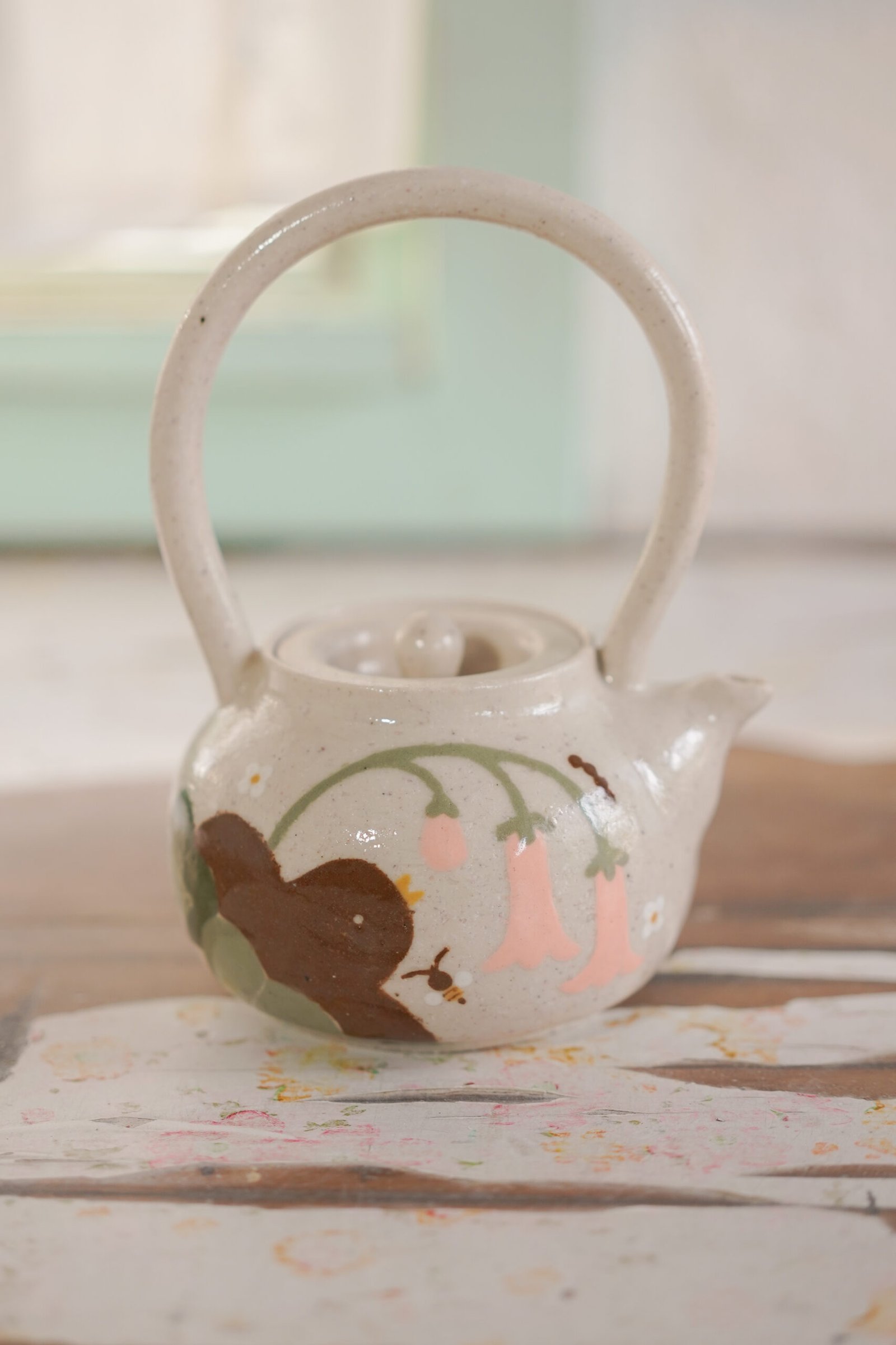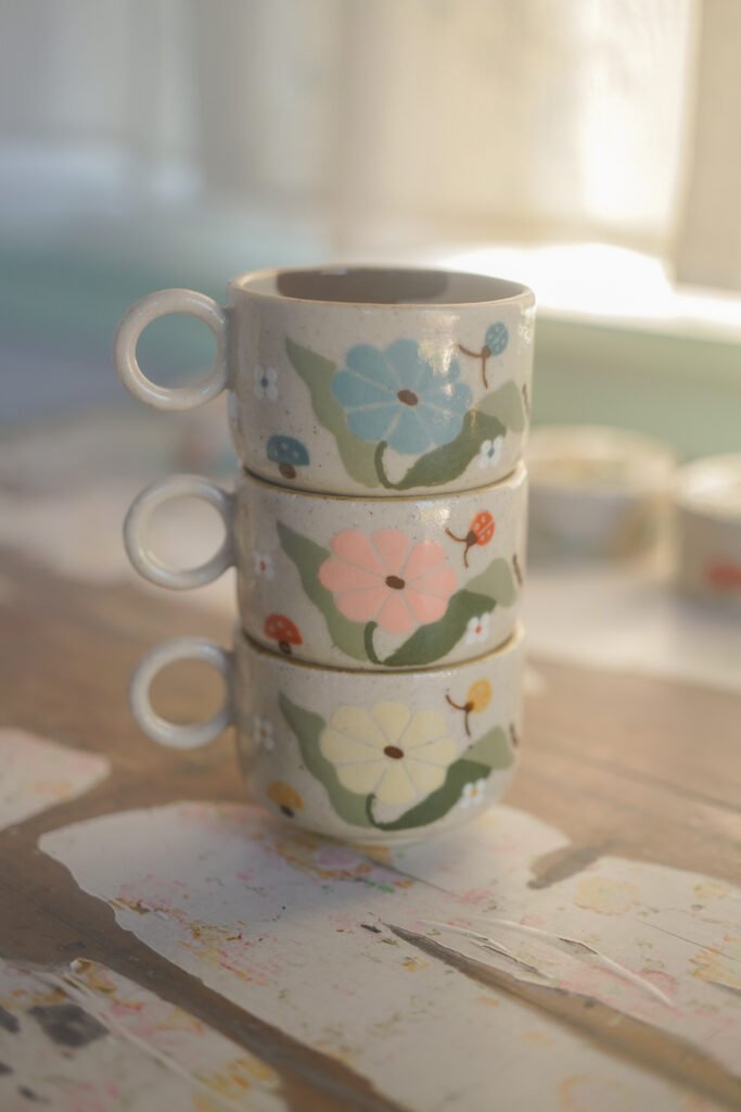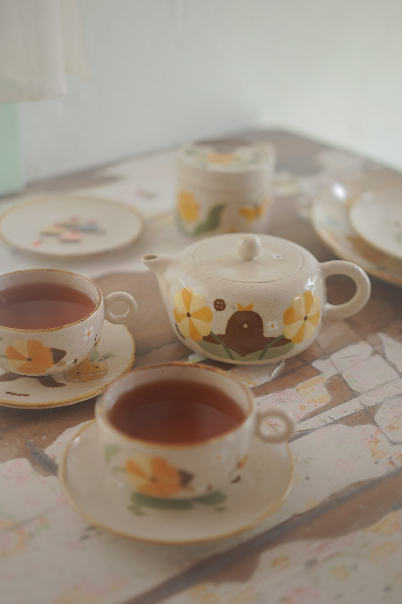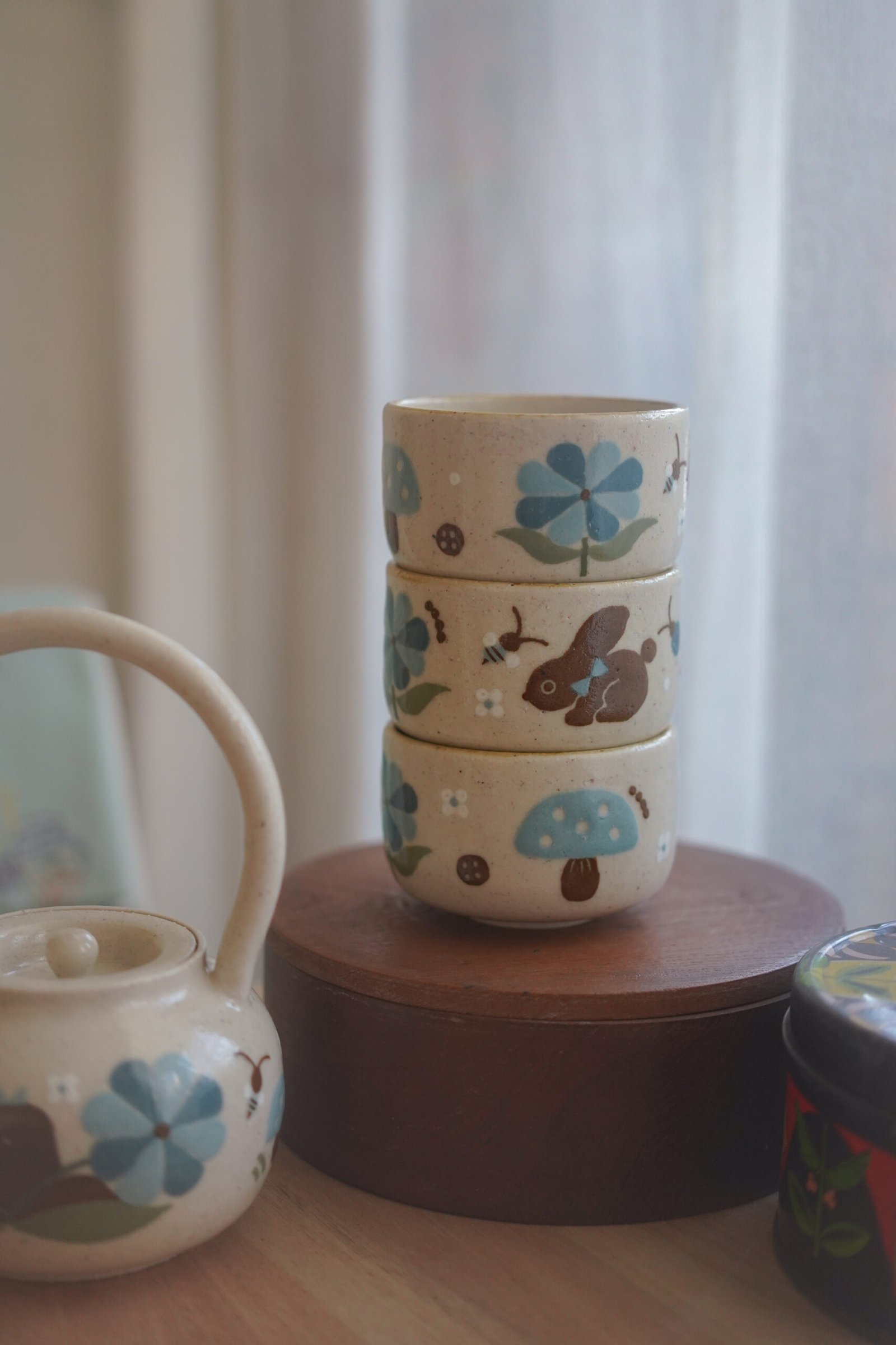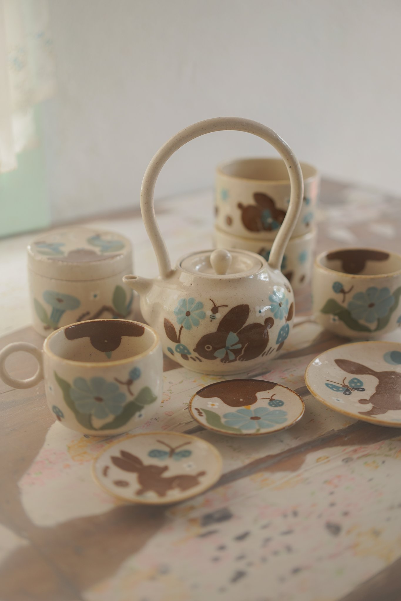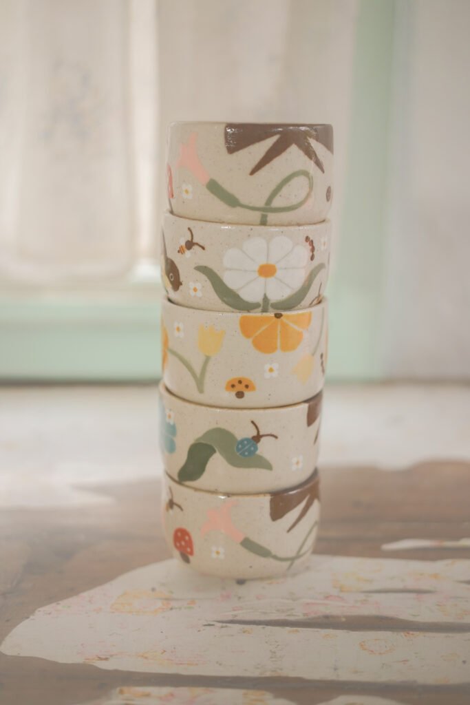 Teteras y tazas hechas en torno alfarero con filtro interno construido / gres de 1230°. Esmaltadas y pintadas a mano.