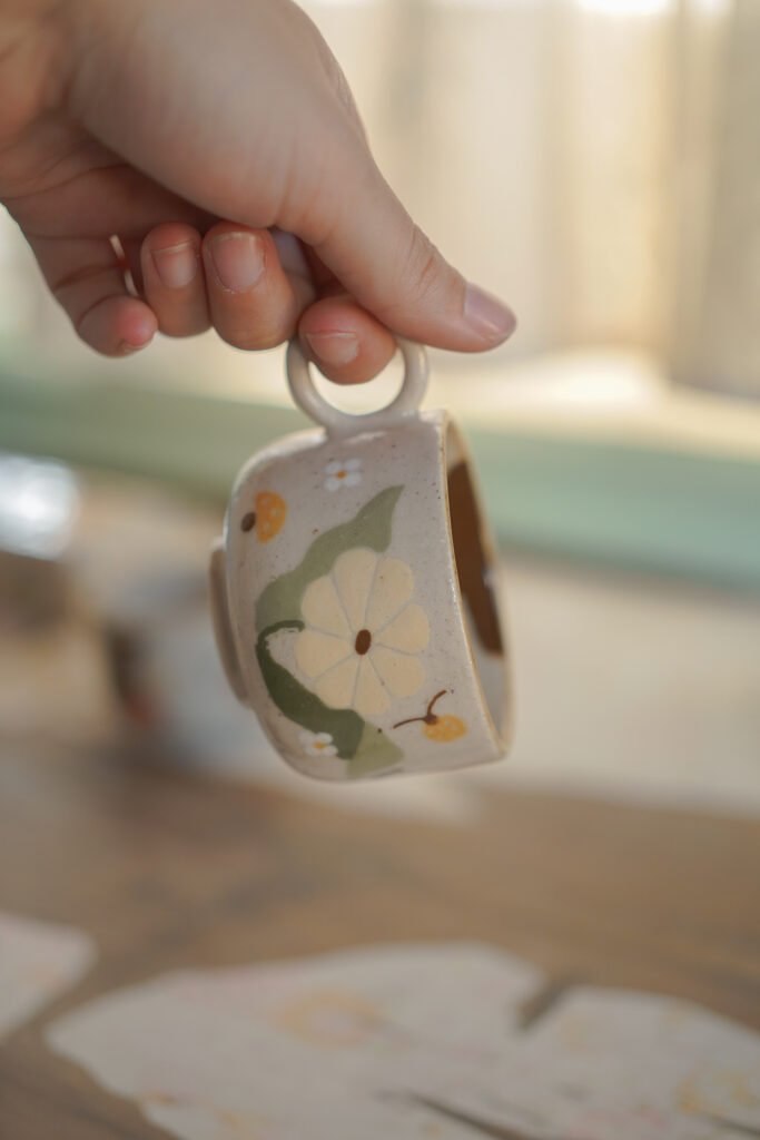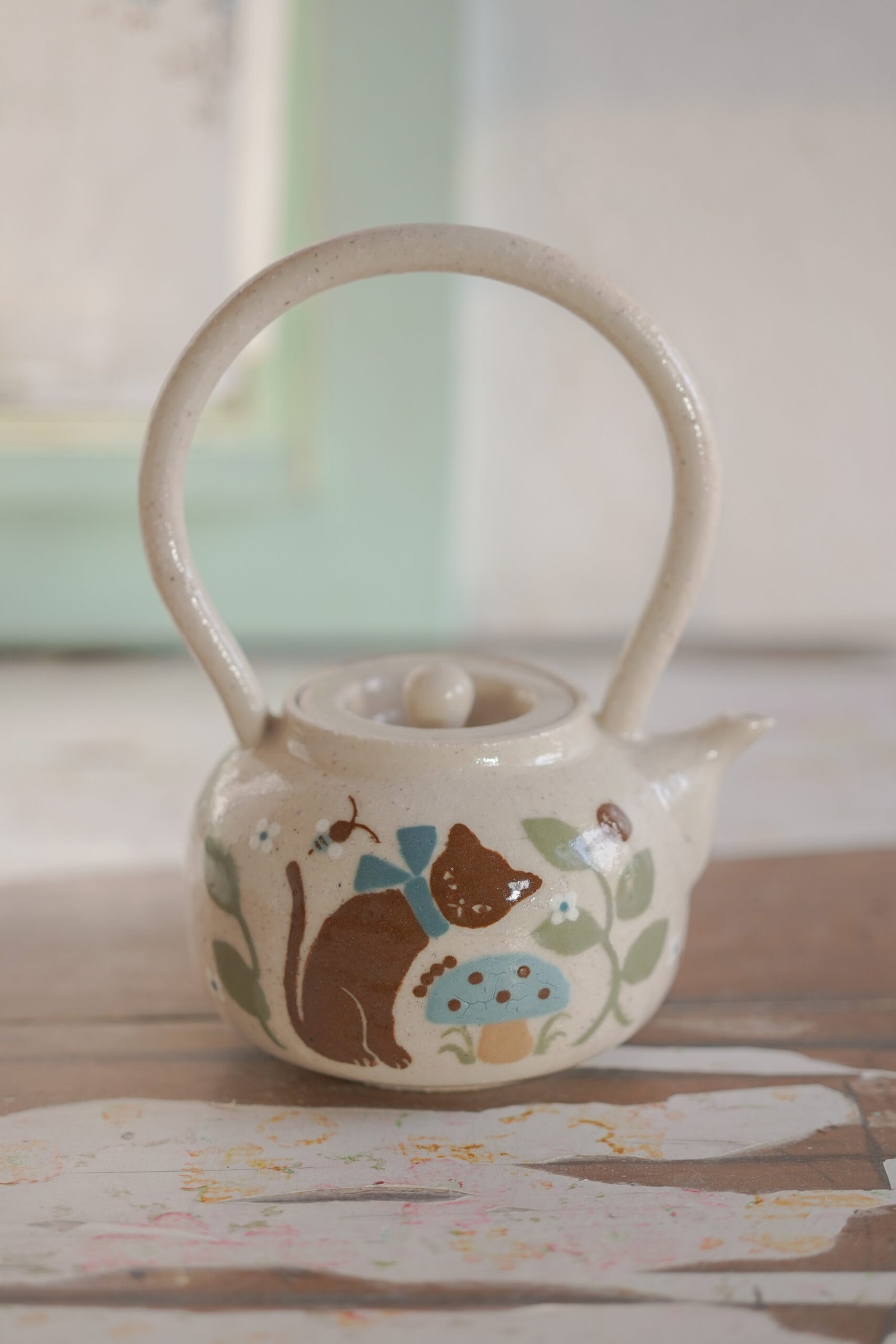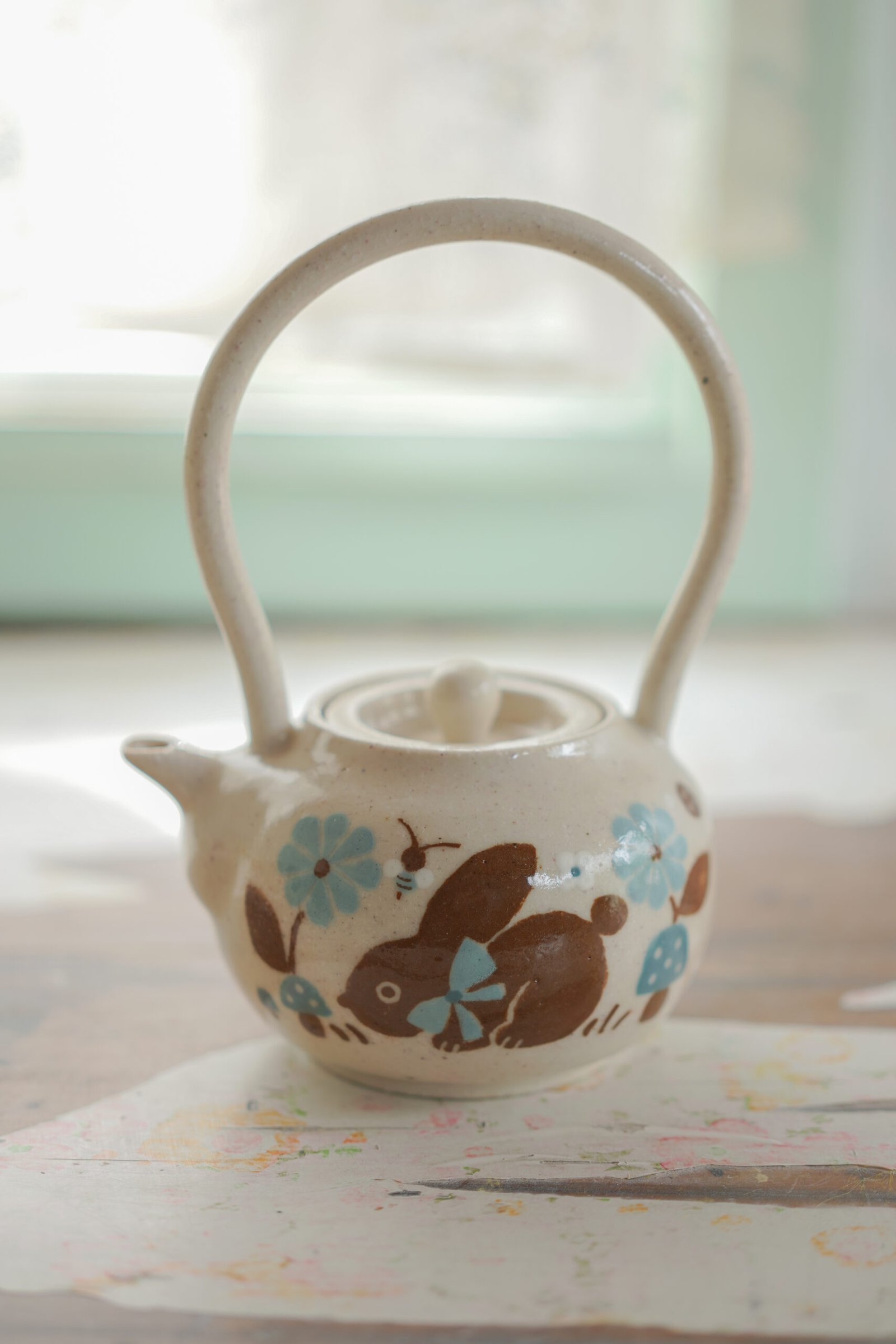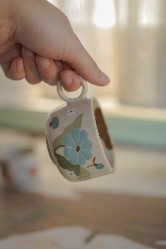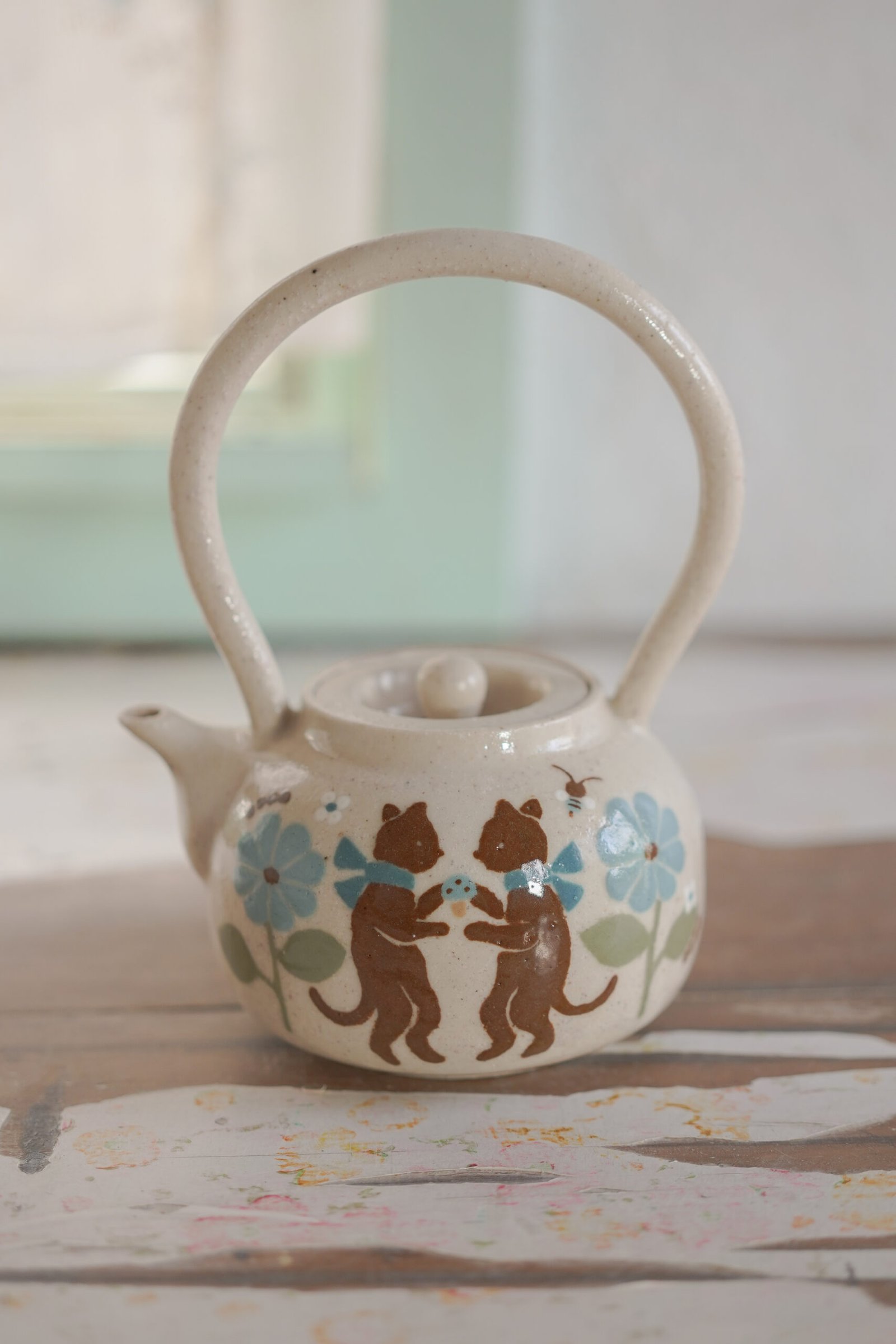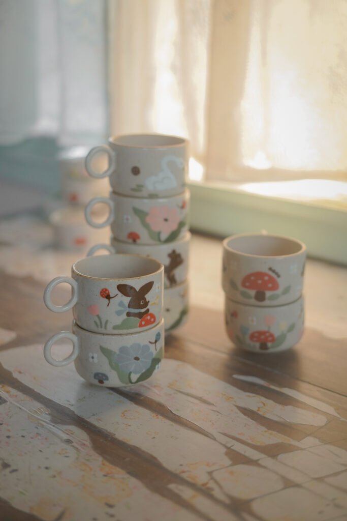 Teteras y tazas hechas en torno alfarero con filtro interno construido / gres de 1230°. Esmaltadas y pintadas a mano.