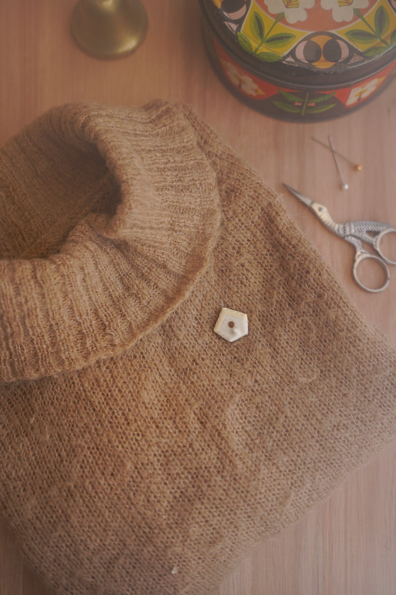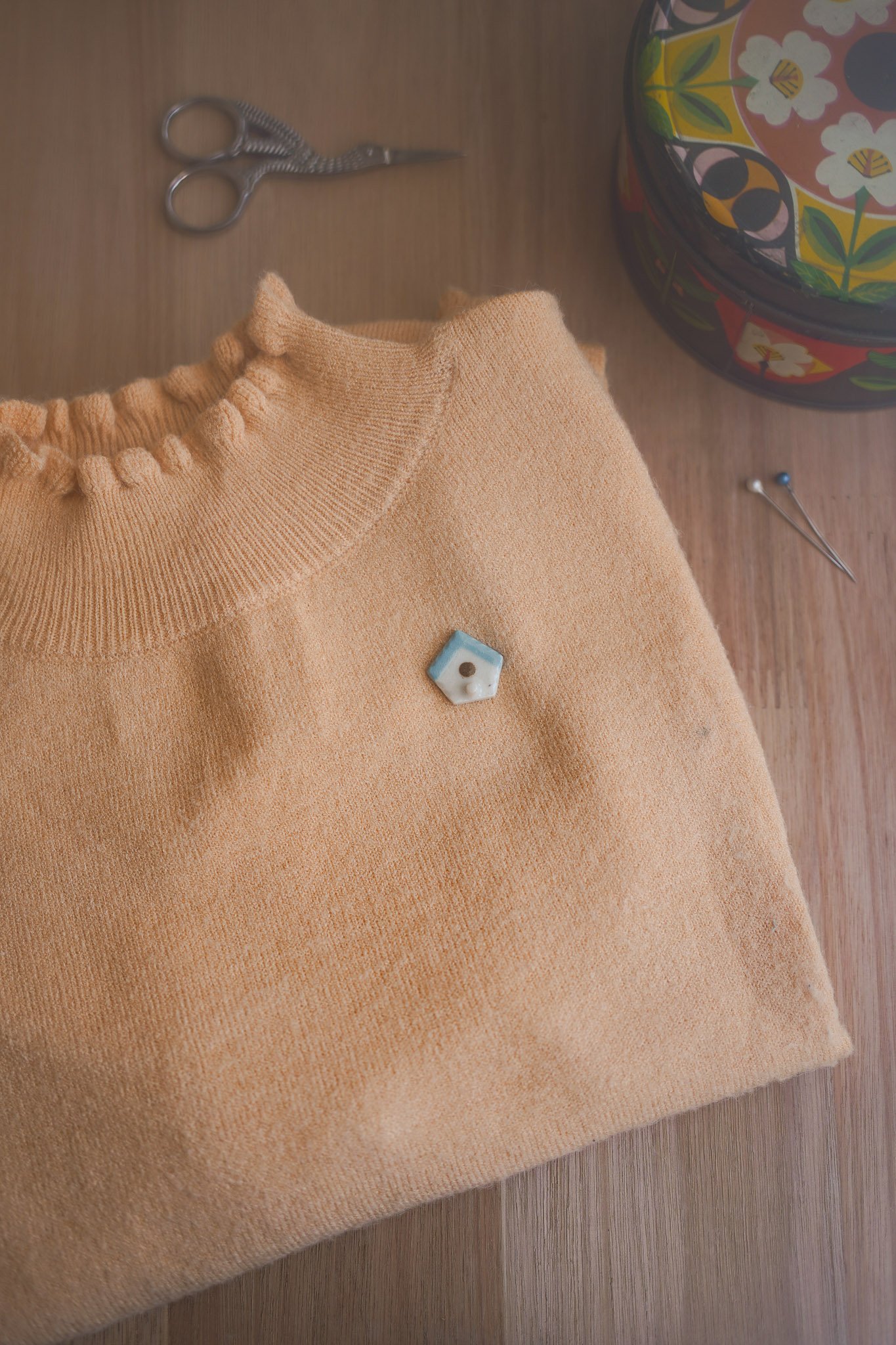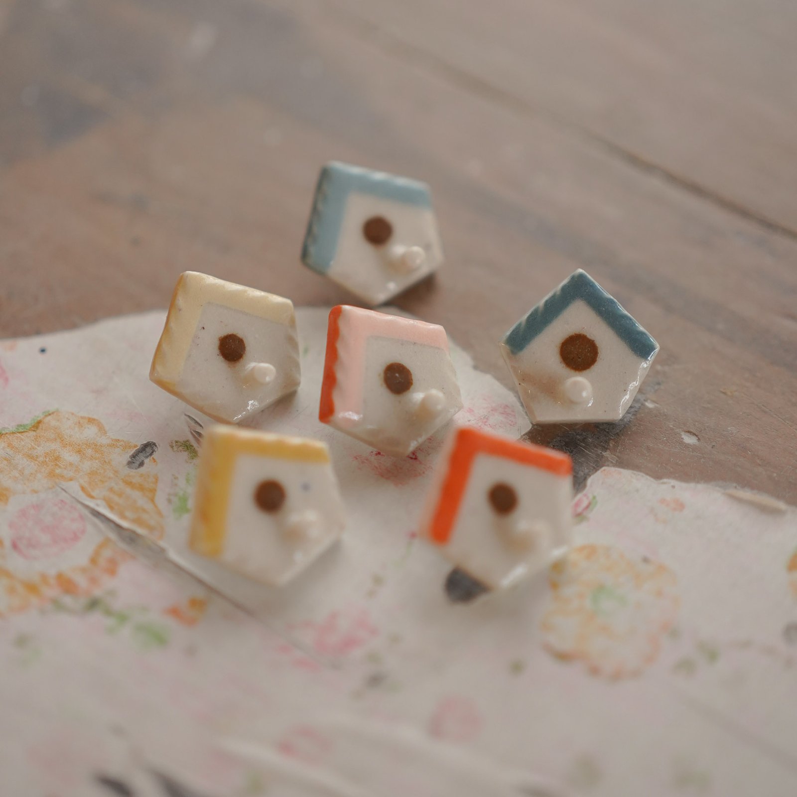 Pequeño broche con forma de casa de pajaro.