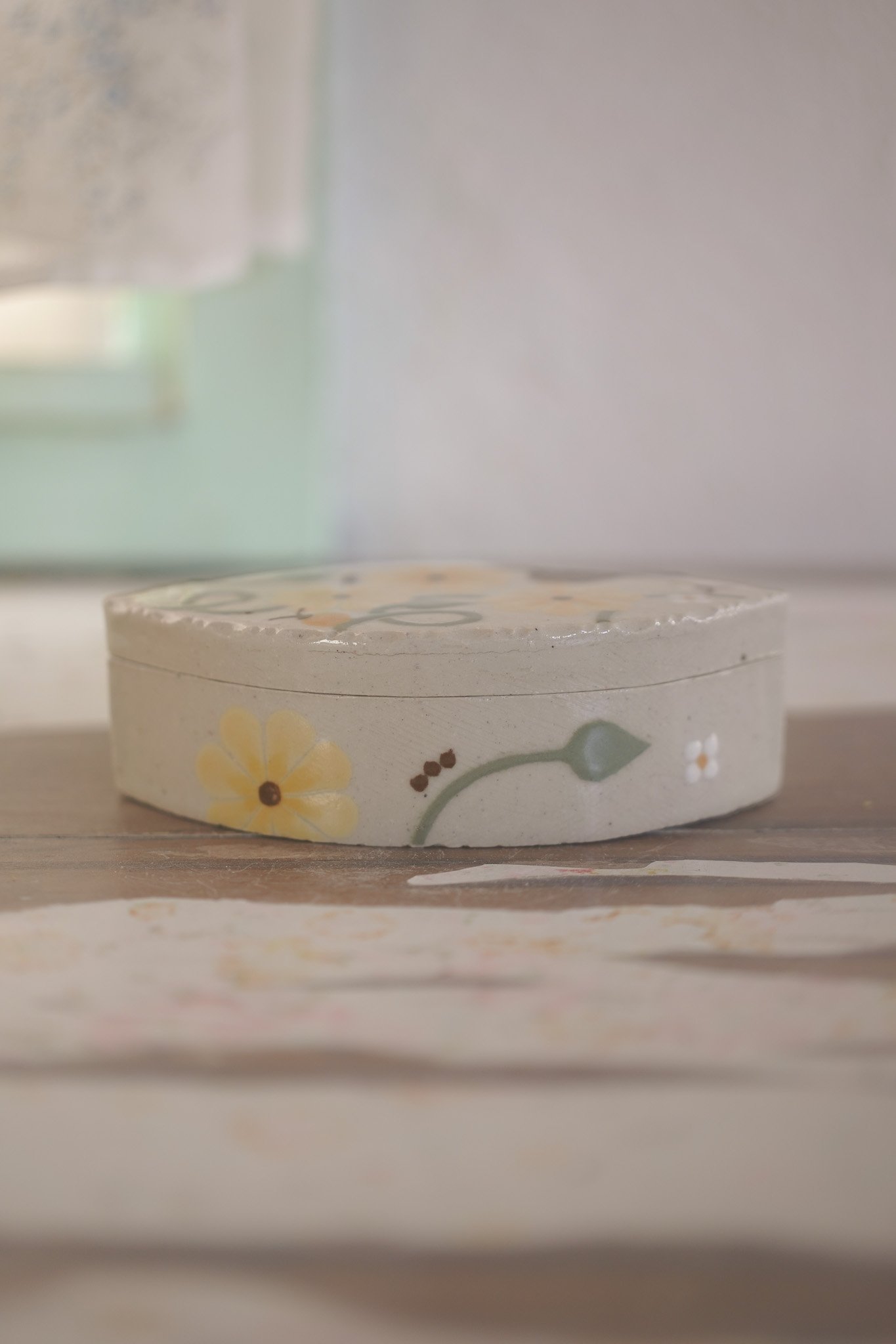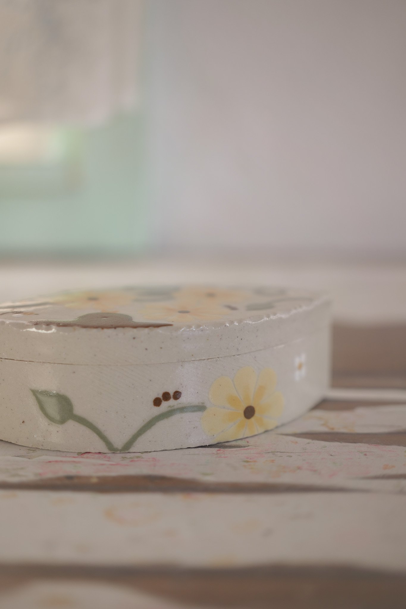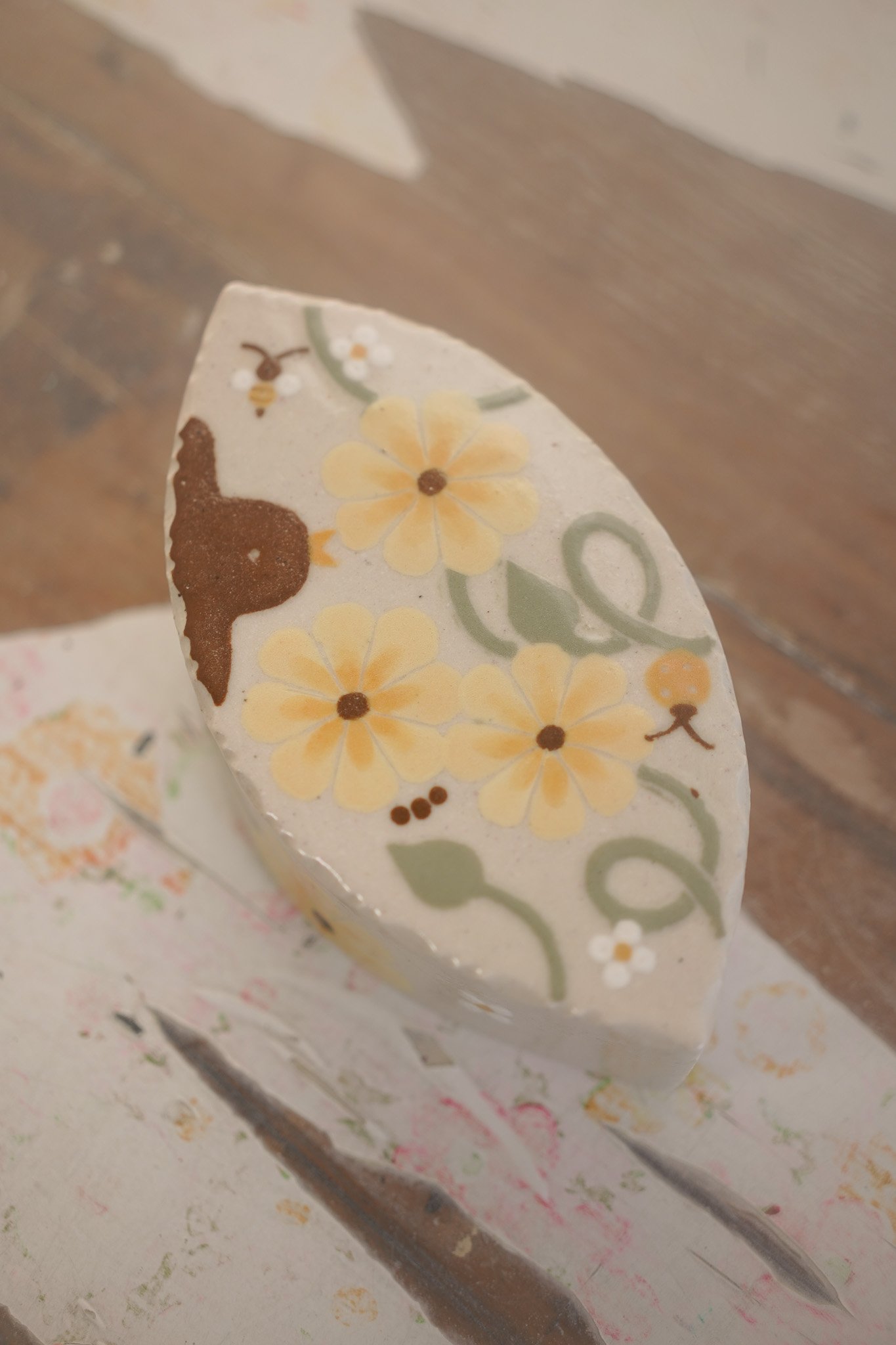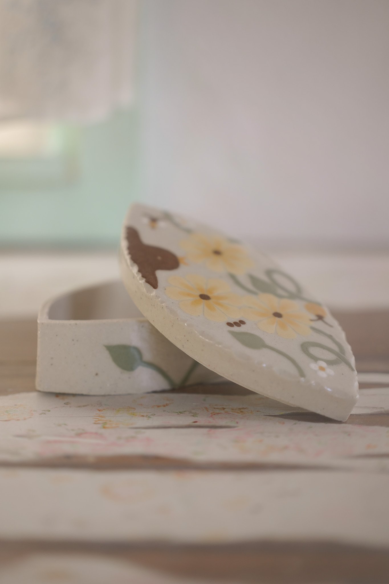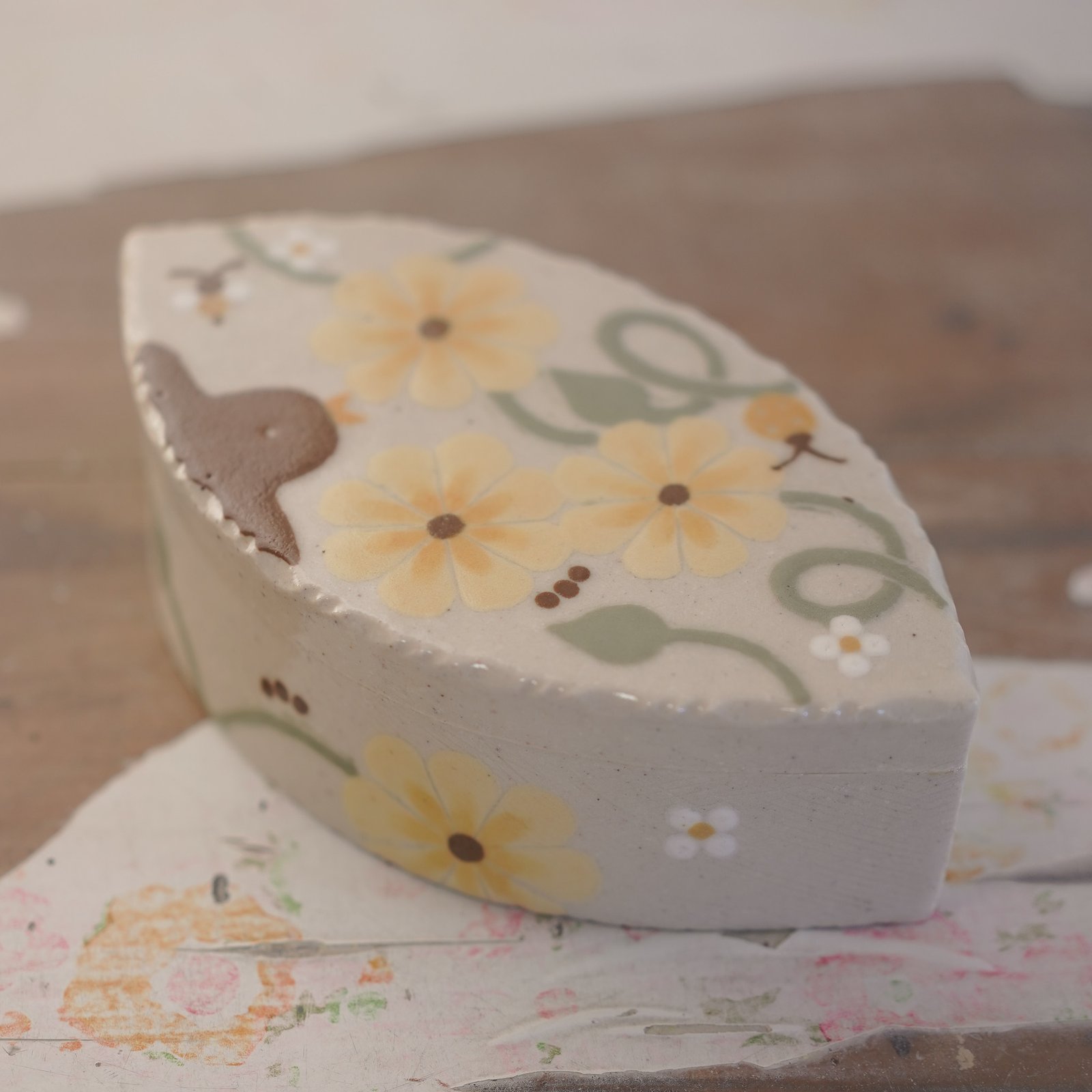 Caja con ilustraciones hecha en gres de 1230°., modelada, pintada y esmaltada a mano.