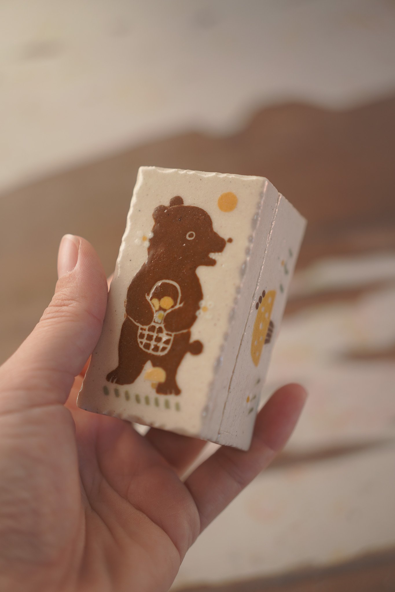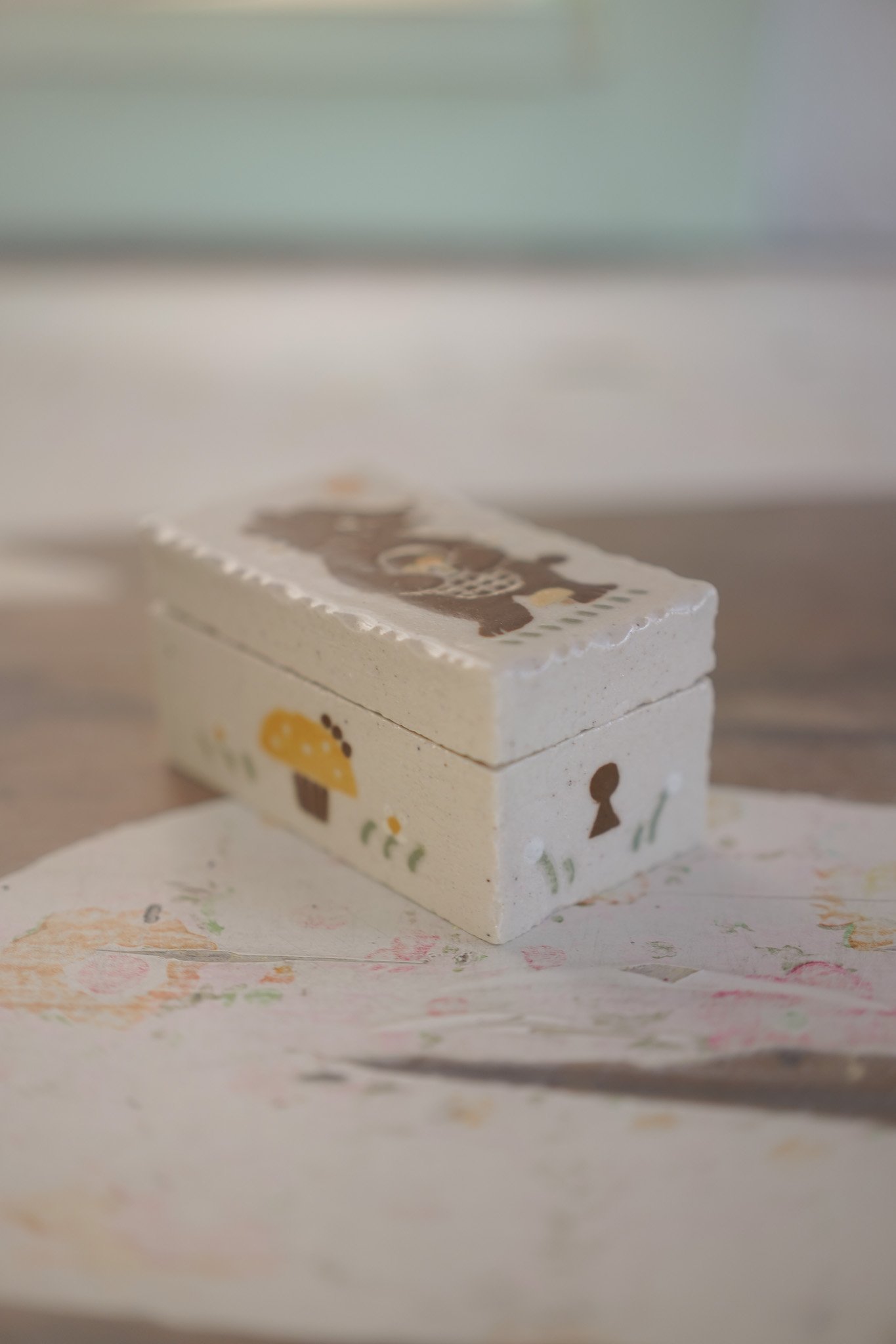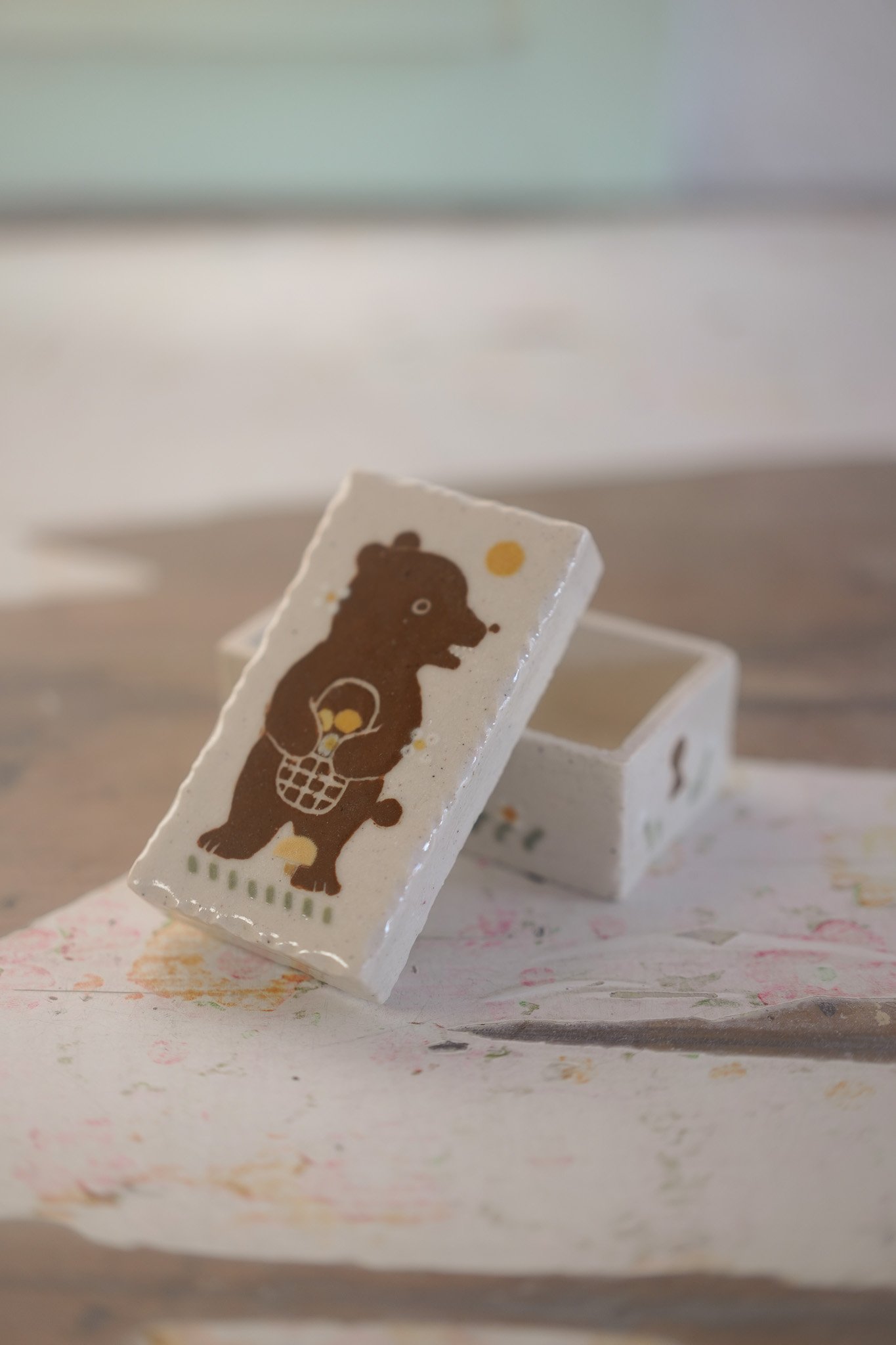 Caja tipo fósforos con ilustraciones hecha en gres de 1230°. Modelada, pintada y esmaltada a mano.