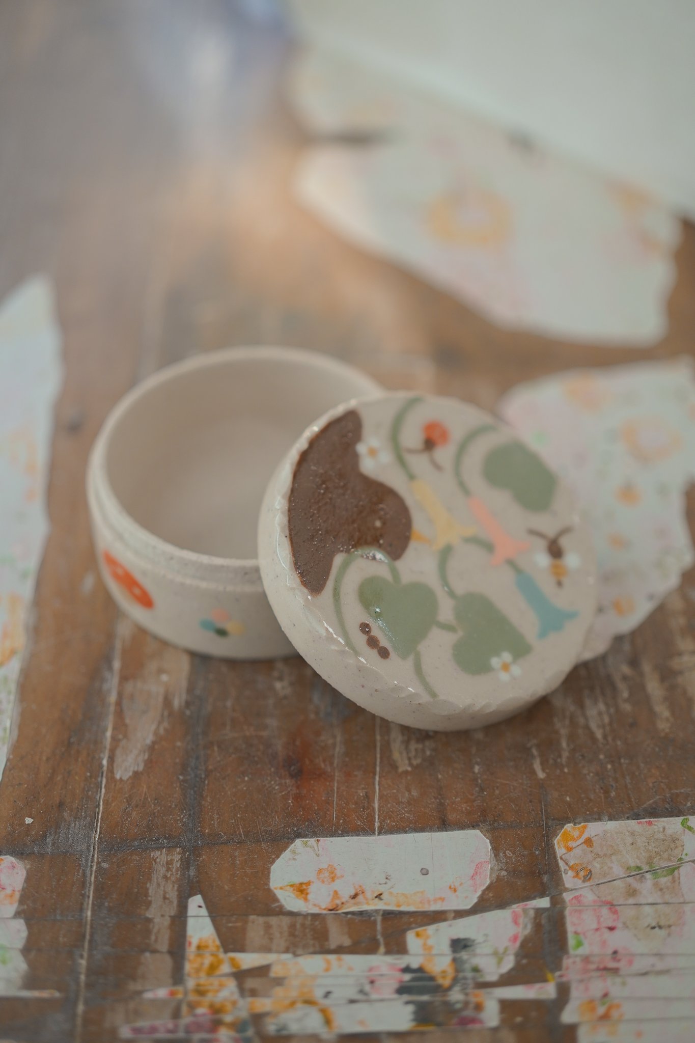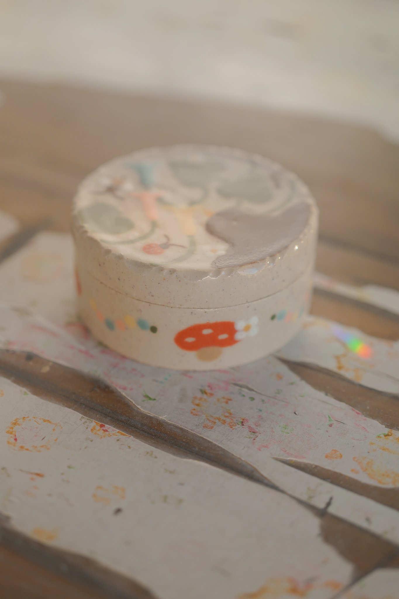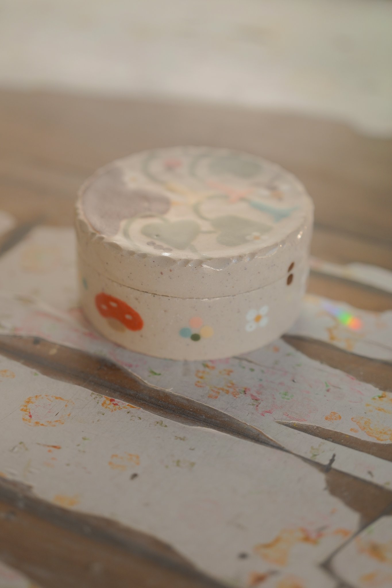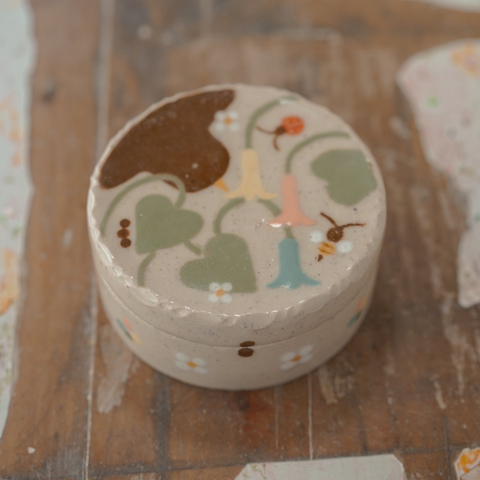 Small round box with illustrations made of 1230° stoneware. Glazed, handmade and painted.