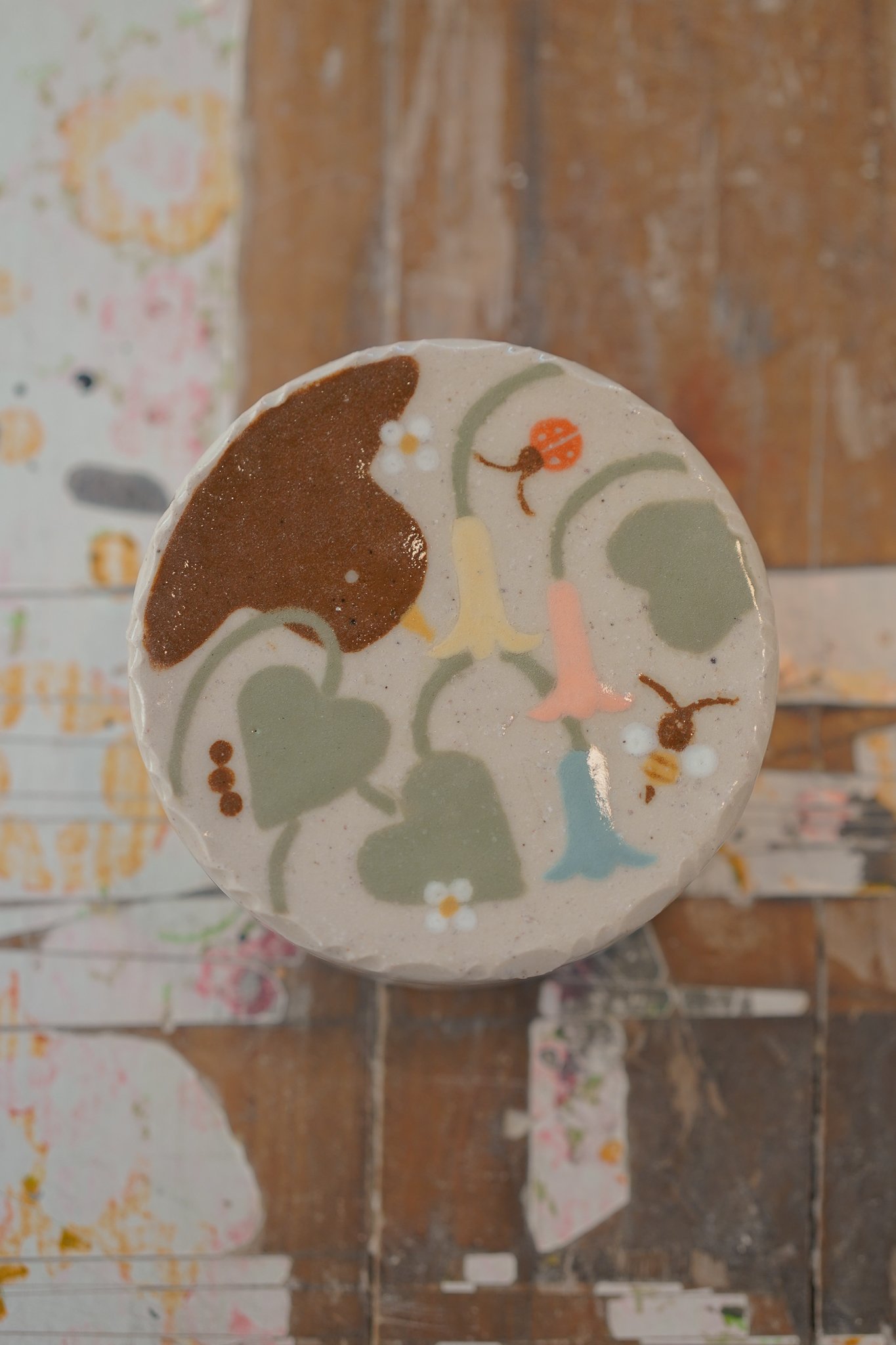 Pequeña caja redonda con ilustraciones hecha en gres de 1230°., torneada, pintada y esmaltada a mano.